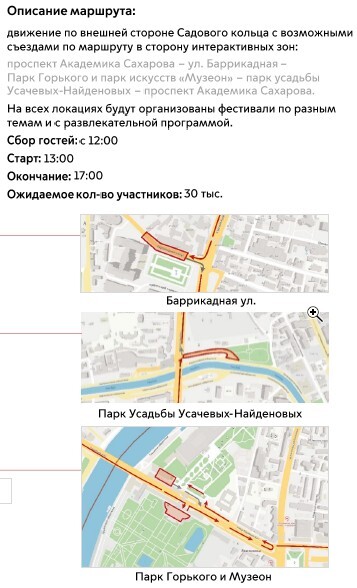 В 13.00 — старт колонны электро-транспорта по Садовому кольцу, протяженность маршрута — 16 км. Предельная скорость 20 км/ч.